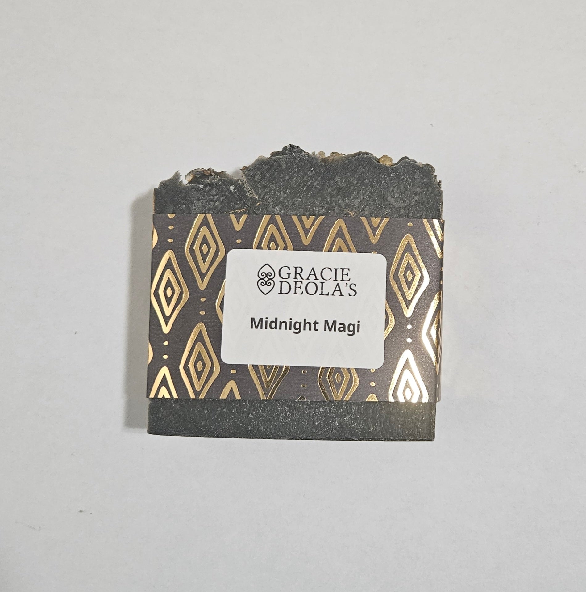Dark, mysterious, and beautifully celestial. Made with activated charcoal and brushed with shimmering gold accents, this bar carries a rich, resinous holiday aroma inspired by ancient ceremonial blends. Enhanced with notes from botanical essences and a hint of citrus warmth.